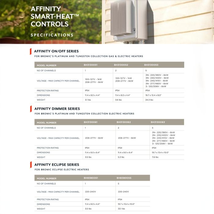 Bromic Affinity Smart-Heat 1 Channel 6KW Dimmer Controller provides a dimming controller for your Platinum or Tungsten series electric heater. The controller will power up up to 6000W across one channel. Suitable for both wall and ceiling mounting. Using the enabled Wi-Fi or Bluetooth connectivity, control and customize your comfort via the Bromic Heating App.