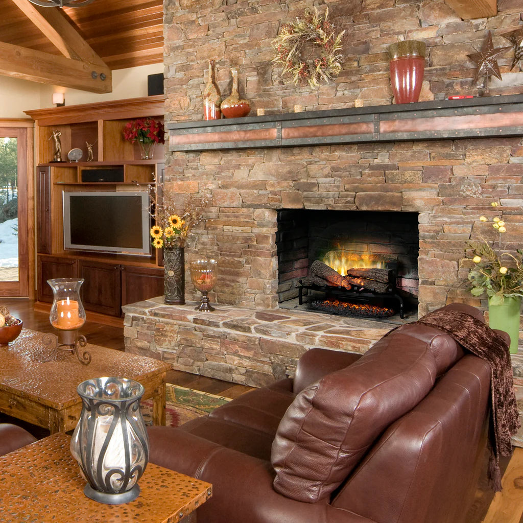 Transform your existing fireplace opening into a stunning focal point with the Dimplex Revillusion 25″ Plug-In Log Set. Designed for plug-in simplicity, this set features realistic cast logs paired with a glowing ash mat for a lifelike wood-burning look. With the advanced Revillusion flame effect creating larger, brighter, and more dynamic flames, you get the ambiance of a real fire without the mess, ash or venting. The fan-forced heater adds supplemental warmth for up to small to medium sized rooms, or you can run the flame-only mode for year-round ambiance. Remote control operation and the easy plug-in set-up make this a convenient and stylish upgrade.