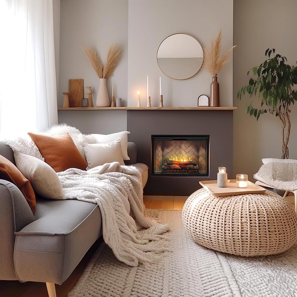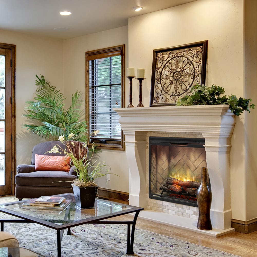 Bring warmth and elegance to your space with the Dimplex Revillusion 36" Built-In Electric Firebox. This sophisticated insert features stunningly lifelike flames and artisan wood logs that create an inviting focal point year-round. Customize your experience with adjustable flame colors, dimming controls, and intelligent mood lighting that adapts to your room's natural brightness. The weathered concrete interior and translucent acrylic panel work together to reflect flames beautifully throughout your space. When you need extra comfort, the ceramic heater efficiently warms up to 1,000 square feet—or simply enjoy the ambiance without heat during warmer seasons. The cool-to-touch glass front keeps your family safe, while the flameless design means no venting, gas lines, or complicated installation required. Choose between hardwiring or using the convenient 120V plug-in cord for ultimate flexibility. Timeless design meets modern convenience in this stunning electric fireplace that transforms any room into a cozy retreat.